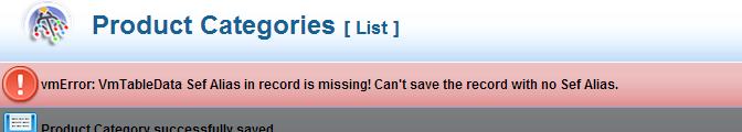 Virtuemart : vmError: VmTableData Sef Alias in record is missing! Can't save the record with no Sef Alias.